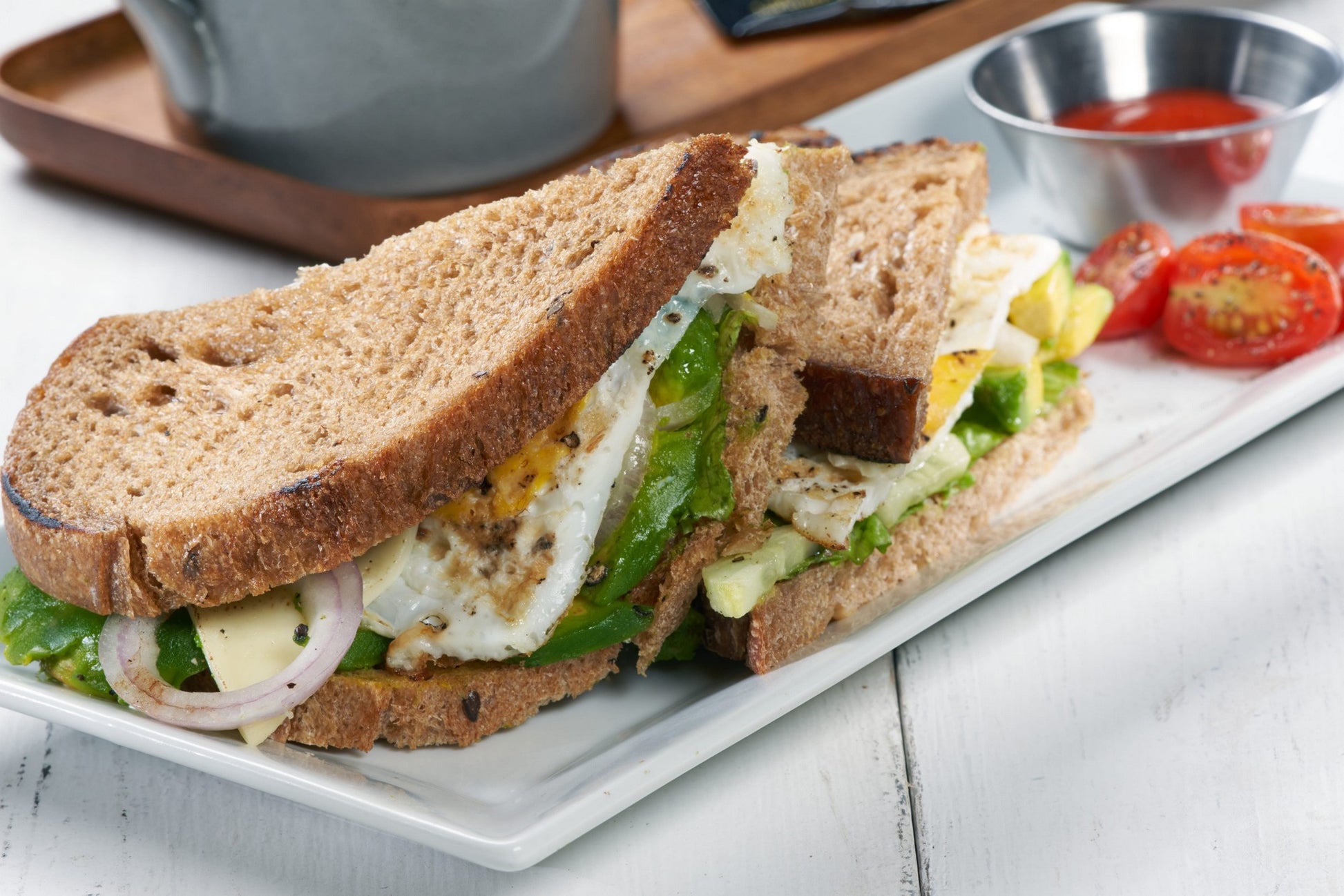 Sliced avocado generously spread over toasted sourdogh bread finished with a sprinkle of freshly craacked black pepper, a pinch of salt and a drizzle of zesty lime juice. Served with fried eggs, cheese, tomatoes and onion ring